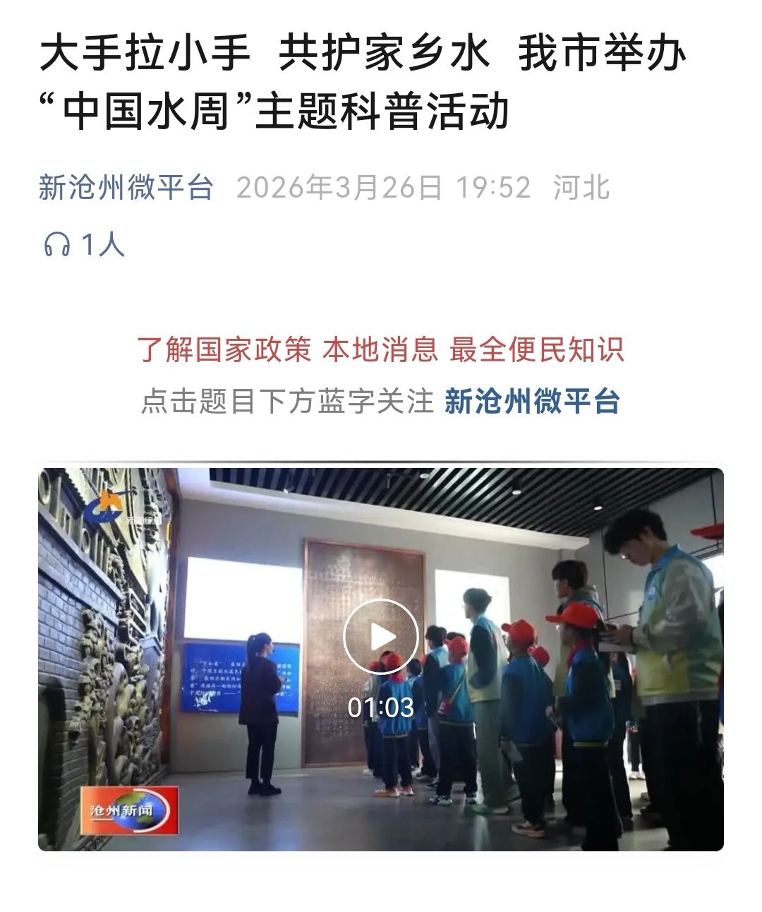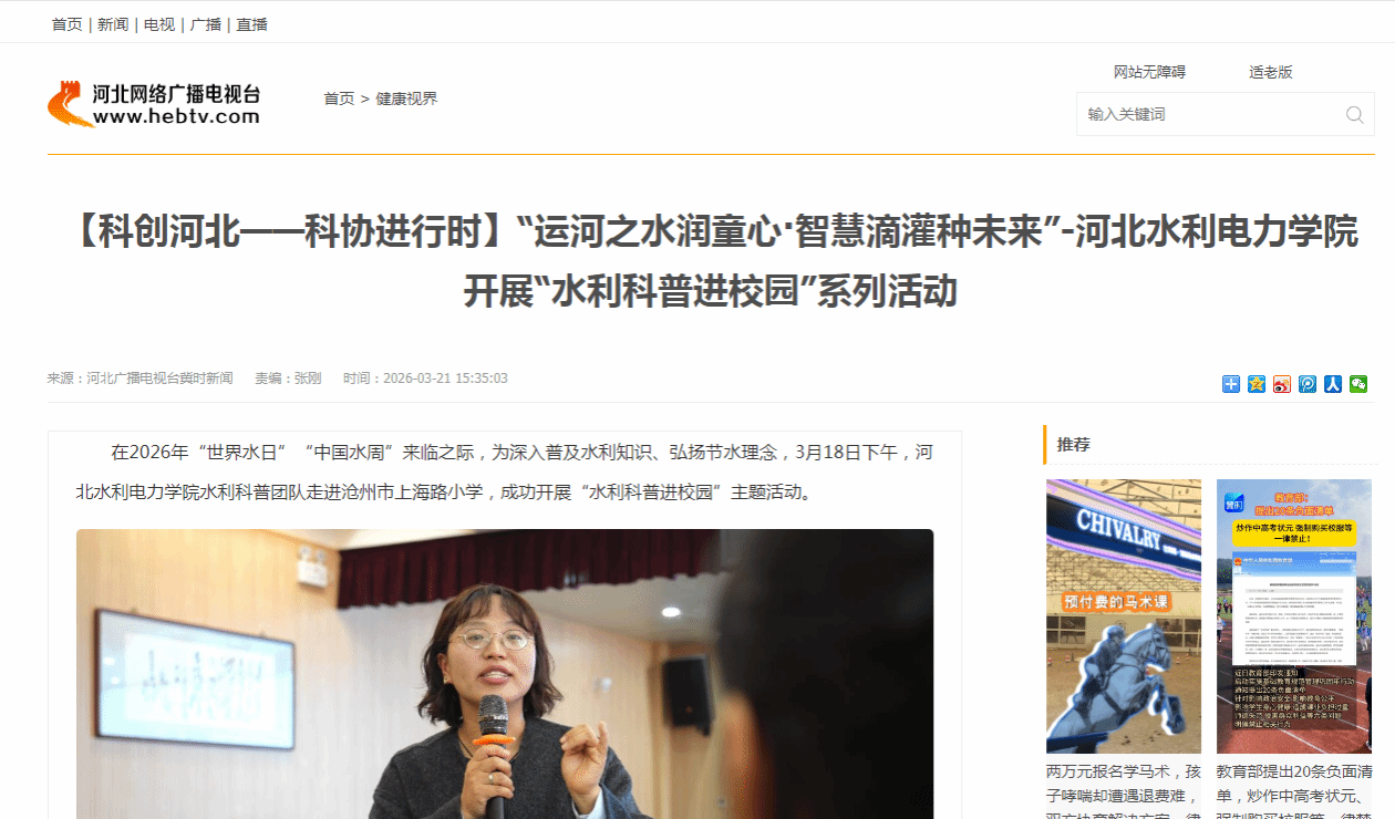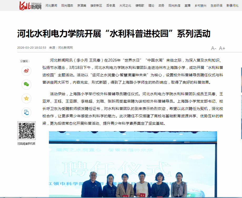 为深入普及水利知识,弘扬节水理念,做好“世界水日”“中国水周”科普宣传教育活动,3月18日下午,我校师生走进沧州市上海路小学,带来一场“运河之水润童心·智慧滴灌种未来”水利科普进校园活动,通过校外科普辅导员聘任与互动讲座等形式,将水利知识带入基础教育课堂;3月24日,我校与黄河路小学组成联合研学团队,赴沧州水利文化展示馆与倒虹吸生态公园开展“筑国家水网安澜,护湿地生态家园”研学实践活动,感受人水共生的生态魅力。两次活动受到广大师生的一致好评。近日,河北新闻网、河北广播电视台冀时新闻、沧州广播电视台等省级和市级媒体纷纷报道我校科普宣传活动。